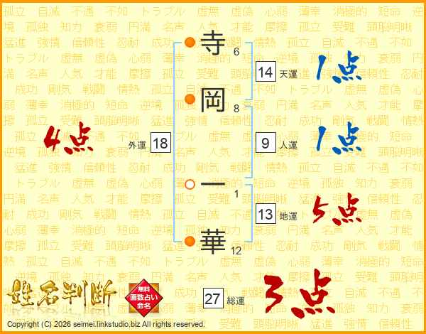 生活面を象徴する運勢です。外部から受ける影響力を表し、結婚運、家庭運や職場、環境への順応性を表します。総運から人運を引いた画数。姓や名が1文字の場合を除く。
