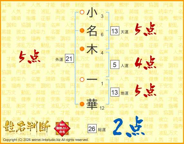 小(3画)名(6画)木(4画) 一(1画)華(12画)
