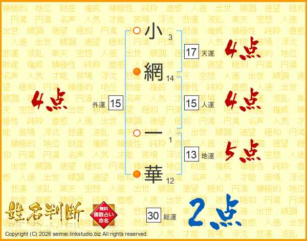 生活面を象徴する運勢です。外部から受ける影響力を表し、結婚運、家庭運や職場、環境への順応性を表します。総運から人運を引いた画数。姓や名が1文字の場合を除く。