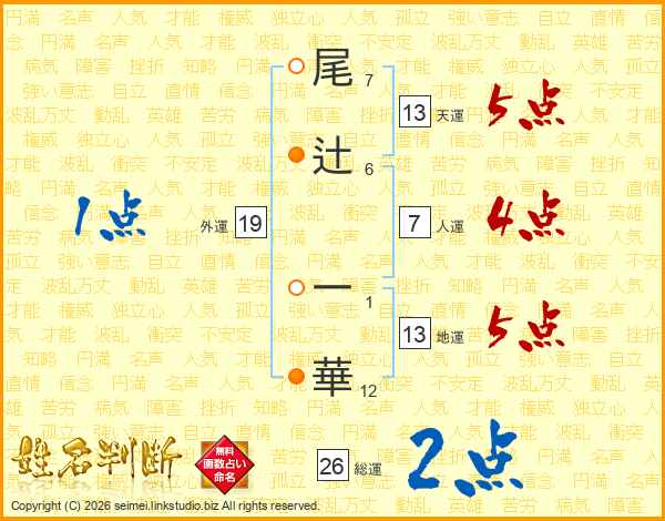 生活面を象徴する運勢です。外部から受ける影響力を表し、結婚運、家庭運や職場、環境への順応性を表します。総運から人運を引いた画数。姓や名が1文字の場合を除く。
