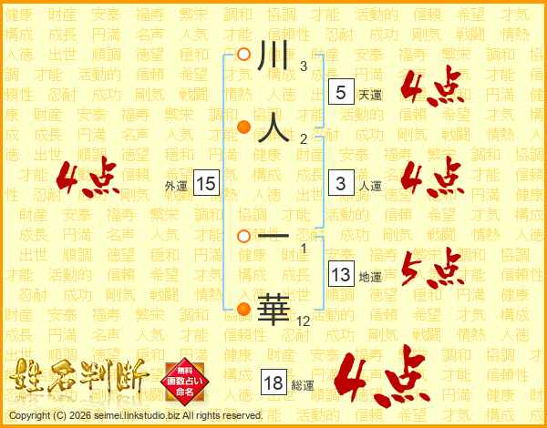 生活面を象徴する運勢です。外部から受ける影響力を表し、結婚運、家庭運や職場、環境への順応性を表します。総運から人運を引いた画数。姓や名が1文字の場合を除く。