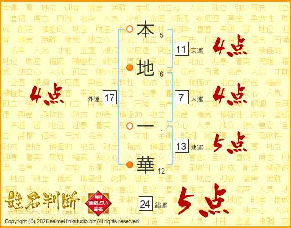 生活面を象徴する運勢です。外部から受ける影響力を表し、結婚運、家庭運や職場、環境への順応性を表します。総運から人運を引いた画数。姓や名が1文字の場合を除く。