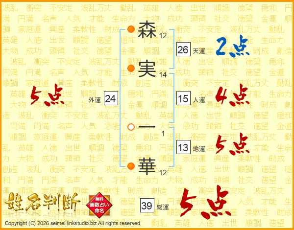 生活面を象徴する運勢です。外部から受ける影響力を表し、結婚運、家庭運や職場、環境への順応性を表します。総運から人運を引いた画数。姓や名が1文字の場合を除く。