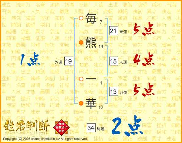 生活面を象徴する運勢です。外部から受ける影響力を表し、結婚運、家庭運や職場、環境への順応性を表します。総運から人運を引いた画数。姓や名が1文字の場合を除く。