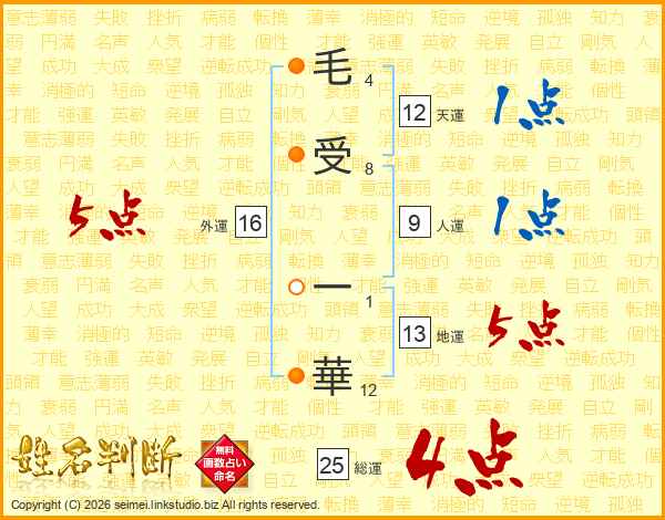 あなたの人生を表す1番重要な運勢です。生涯を通じて影響する総合運となり、主に50歳以降の晩年期に影響を及ぼします。苗字と名前の合計画数。