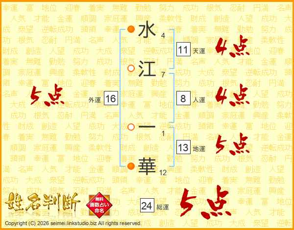あなたの人生を表す1番重要な運勢です。生涯を通じて影響する総合運となり、主に50歳以降の晩年期に影響を及ぼします。苗字と名前の合計画数。