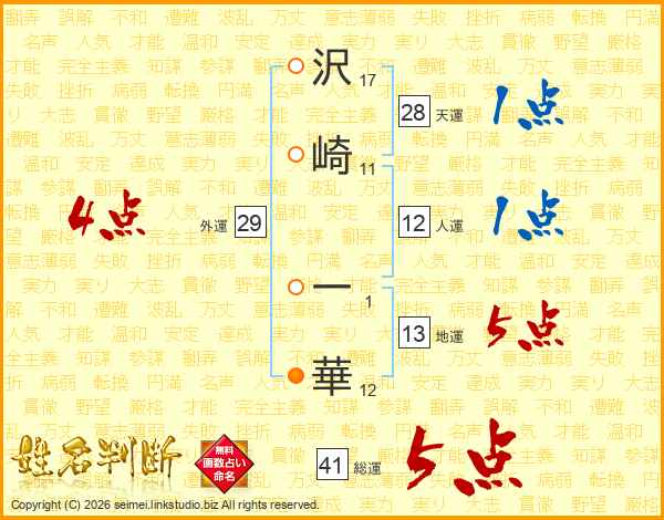 生活面を象徴する運勢です。外部から受ける影響力を表し、結婚運、家庭運や職場、環境への順応性を表します。総運から人運を引いた画数。姓や名が1文字の場合を除く。