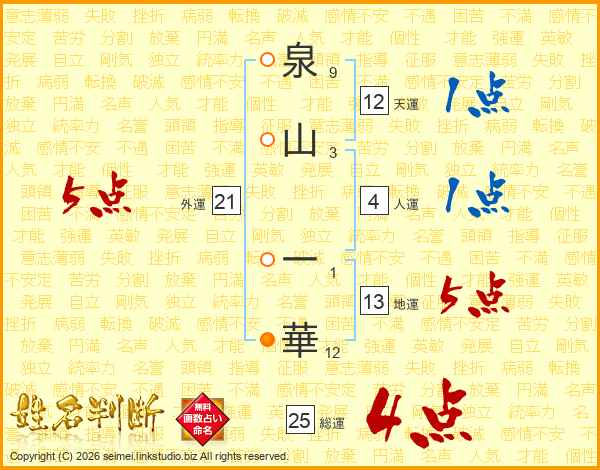 泉(9画)山(3画) 一(1画)華(12画)