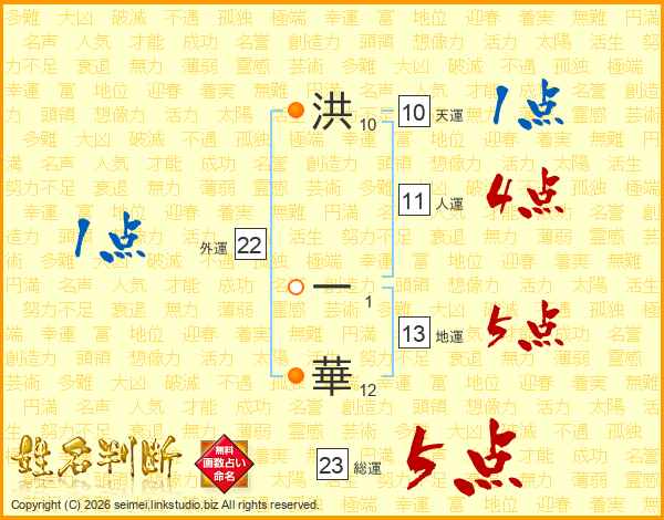 あなたの人生を表す1番重要な運勢です。生涯を通じて影響する総合運となり、主に50歳以降の晩年期に影響を及ぼします。苗字と名前の合計画数。