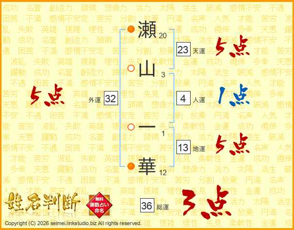 生活面を象徴する運勢です。外部から受ける影響力を表し、結婚運、家庭運や職場、環境への順応性を表します。総運から人運を引いた画数。姓や名が1文字の場合を除く。