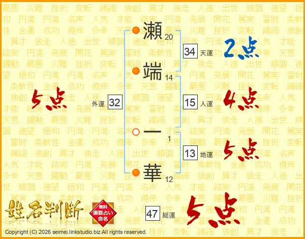 瀬端一華さんの総運は47画の5点!
