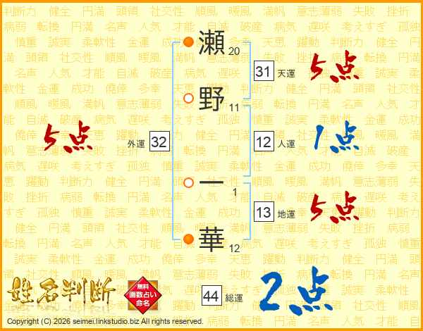 生活面を象徴する運勢です。外部から受ける影響力を表し、結婚運、家庭運や職場、環境への順応性を表します。総運から人運を引いた画数。姓や名が1文字の場合を除く。