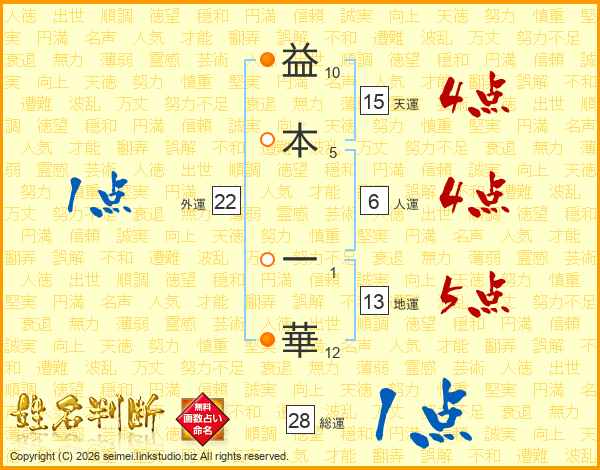 生活面を象徴する運勢です。外部から受ける影響力を表し、結婚運、家庭運や職場、環境への順応性を表します。総運から人運を引いた画数。姓や名が1文字の場合を除く。
