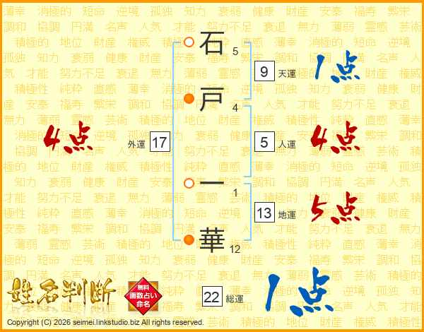生活面を象徴する運勢です。外部から受ける影響力を表し、結婚運、家庭運や職場、環境への順応性を表します。総運から人運を引いた画数。姓や名が1文字の場合を除く。