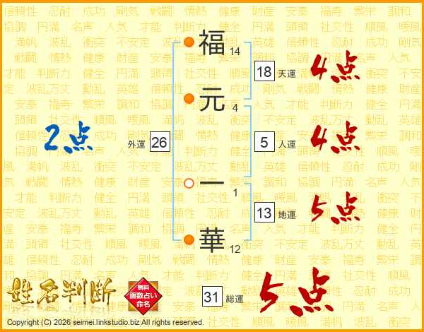 生活面を象徴する運勢です。外部から受ける影響力を表し、結婚運、家庭運や職場、環境への順応性を表します。総運から人運を引いた画数。姓や名が1文字の場合を除く。