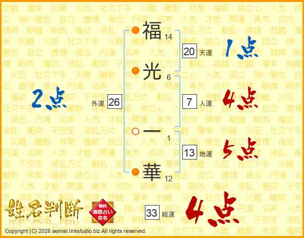 生活面を象徴する運勢です。外部から受ける影響力を表し、結婚運、家庭運や職場、環境への順応性を表します。総運から人運を引いた画数。姓や名が1文字の場合を除く。