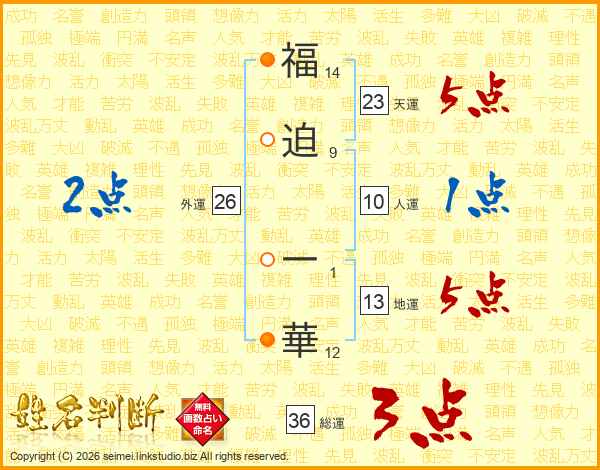 生活面を象徴する運勢です。外部から受ける影響力を表し、結婚運、家庭運や職場、環境への順応性を表します。総運から人運を引いた画数。姓や名が1文字の場合を除く。
