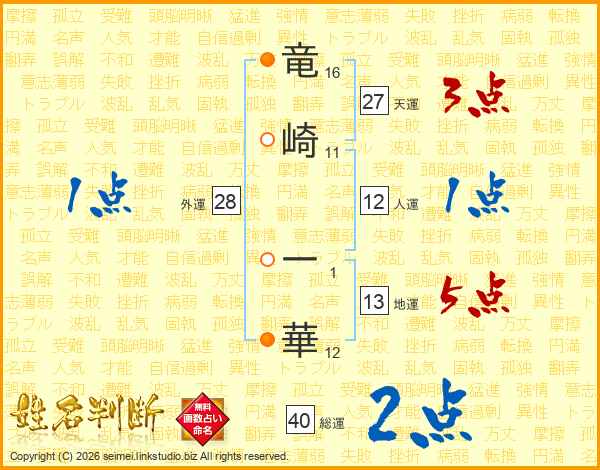 生活面を象徴する運勢です。外部から受ける影響力を表し、結婚運、家庭運や職場、環境への順応性を表します。総運から人運を引いた画数。姓や名が1文字の場合を除く。