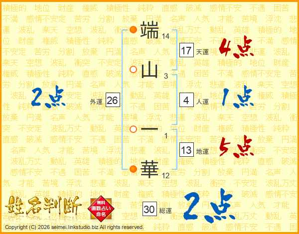 生活面を象徴する運勢です。外部から受ける影響力を表し、結婚運、家庭運や職場、環境への順応性を表します。総運から人運を引いた画数。姓や名が1文字の場合を除く。