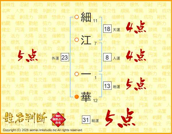 あなたの人生を表す1番重要な運勢です。生涯を通じて影響する総合運となり、主に50歳以降の晩年期に影響を及ぼします。苗字と名前の合計画数。