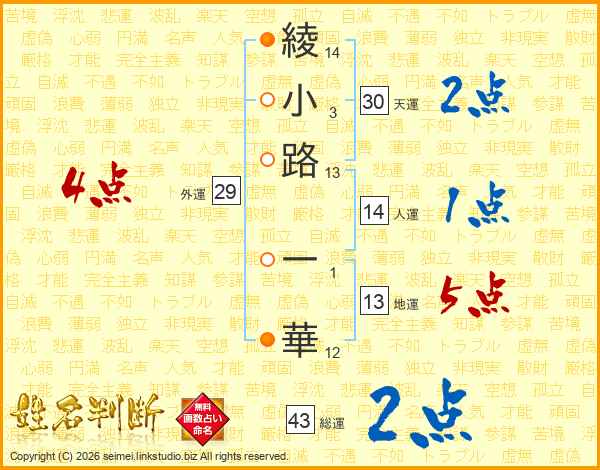綾(14画)小(3画)路(13画) 一(1画)華(12画)