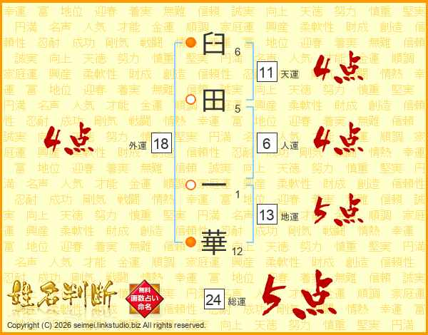 生活面を象徴する運勢です。外部から受ける影響力を表し、結婚運、家庭運や職場、環境への順応性を表します。総運から人運を引いた画数。姓や名が1文字の場合を除く。