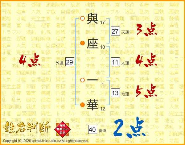 生活面を象徴する運勢です。外部から受ける影響力を表し、結婚運、家庭運や職場、環境への順応性を表します。総運から人運を引いた画数。姓や名が1文字の場合を除く。
