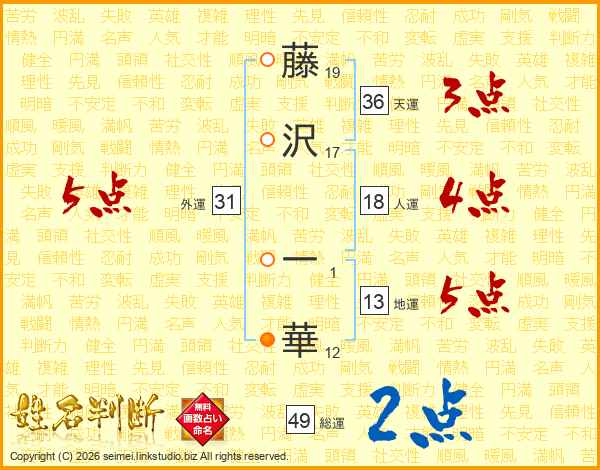 あなたの人生を表す1番重要な運勢です。生涯を通じて影響する総合運となり、主に50歳以降の晩年期に影響を及ぼします。苗字と名前の合計画数。