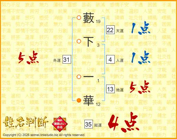 生活面を象徴する運勢です。外部から受ける影響力を表し、結婚運、家庭運や職場、環境への順応性を表します。総運から人運を引いた画数。姓や名が1文字の場合を除く。
