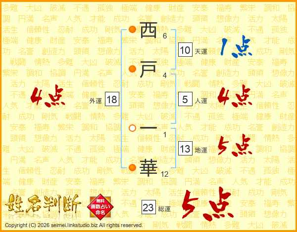 生活面を象徴する運勢です。外部から受ける影響力を表し、結婚運、家庭運や職場、環境への順応性を表します。総運から人運を引いた画数。姓や名が1文字の場合を除く。