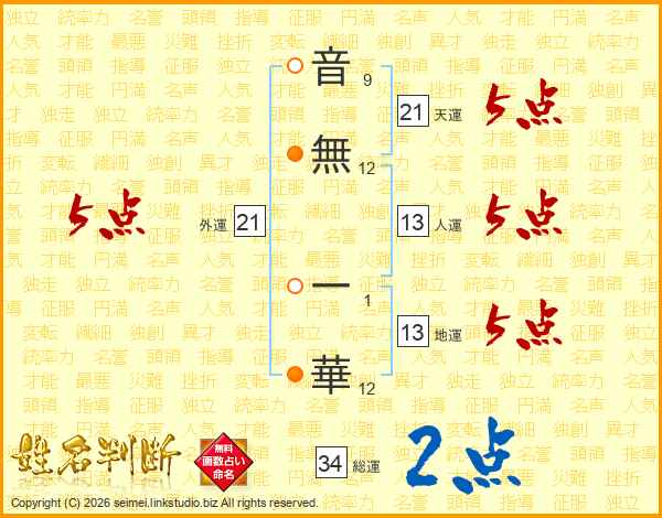 あなたの人生を表す1番重要な運勢です。生涯を通じて影響する総合運となり、主に50歳以降の晩年期に影響を及ぼします。苗字と名前の合計画数。