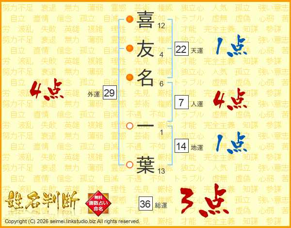 喜(12画)友(4画)名(6画) 一(1画)葉(13画)