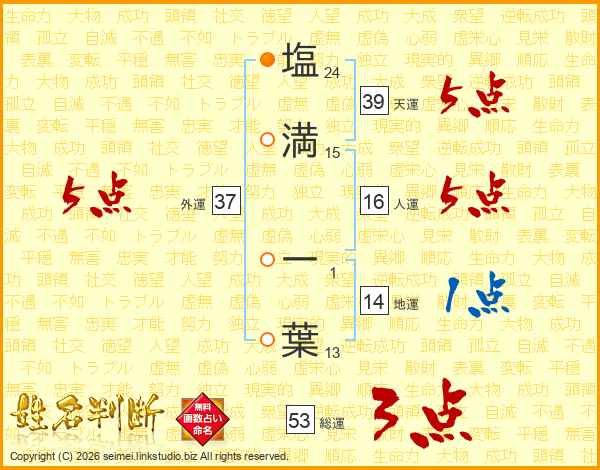 生活面を象徴する運勢です。外部から受ける影響力を表し、結婚運、家庭運や職場、環境への順応性を表します。総運から人運を引いた画数。姓や名が1文字の場合を除く。