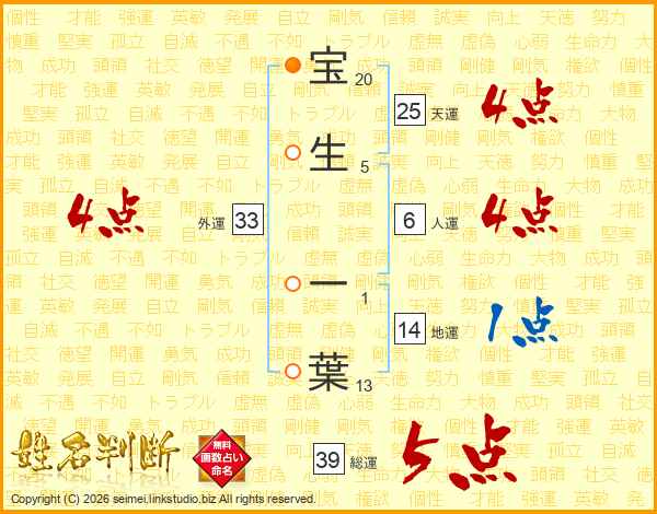 宝(20画)生(5画) 一(1画)葉(13画)