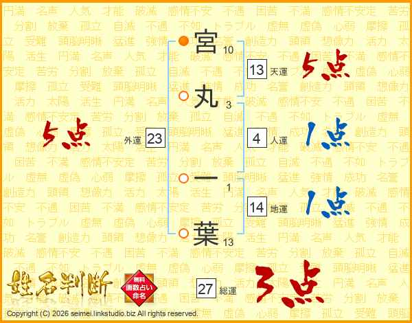 宮(10画)丸(3画) 一(1画)葉(13画)