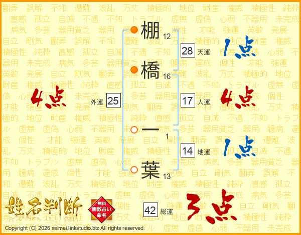 棚(12画)橋(16画) 一(1画)葉(13画)