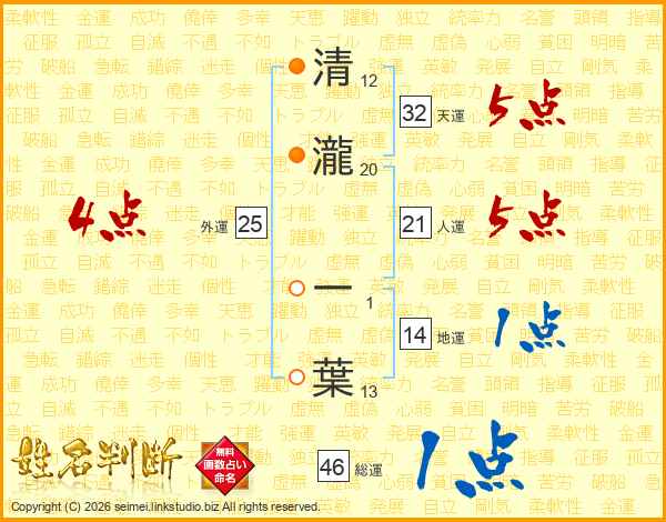 清(12画)瀧(20画) 一(1画)葉(13画)