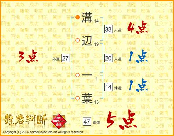 生活面を象徴する運勢です。外部から受ける影響力を表し、結婚運、家庭運や職場、環境への順応性を表します。総運から人運を引いた画数。姓や名が1文字の場合を除く。