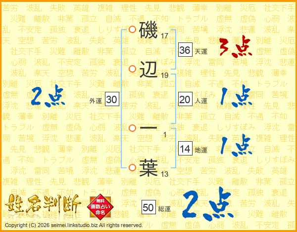 磯(17画)辺(19画) 一(1画)葉(13画)
