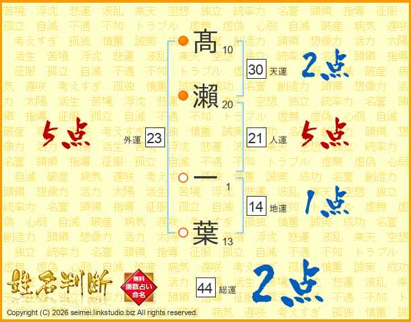髙(10画)瀨(20画) 一(1画)葉(13画)