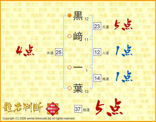 黒(12画)﨑(11画) 一(1画)葉(13画)