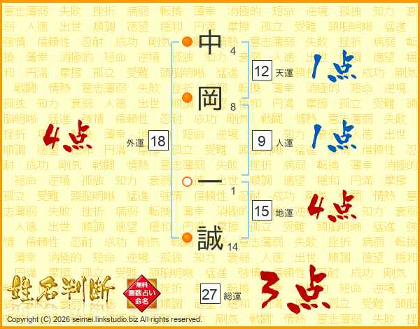中(4画)岡(8画) 一(1画)誠(14画)