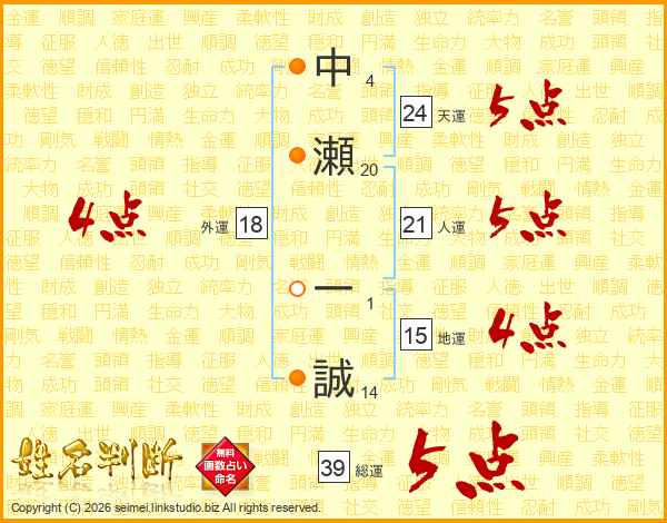 中(4画)瀬(20画) 一(1画)誠(14画)