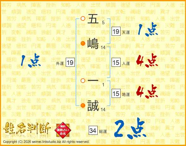 五(5画)嶋(14画) 一(1画)誠(14画)