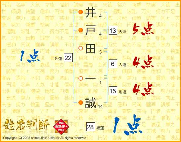井(4画)戸(4画)田(5画) 一(1画)誠(14画)