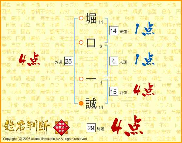 生活面を象徴する運勢です。外部から受ける影響力を表し、結婚運、家庭運や職場、環境への順応性を表します。総運から人運を引いた画数。姓や名が1文字の場合を除く。