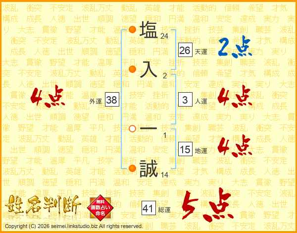 生活面を象徴する運勢です。外部から受ける影響力を表し、結婚運、家庭運や職場、環境への順応性を表します。総運から人運を引いた画数。姓や名が1文字の場合を除く。
