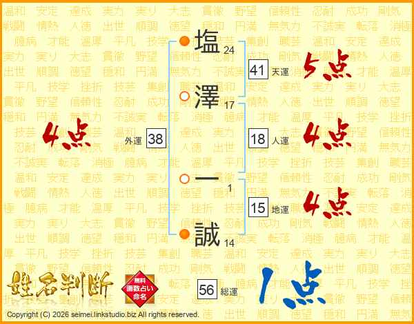 塩(24画)澤(17画) 一(1画)誠(14画)