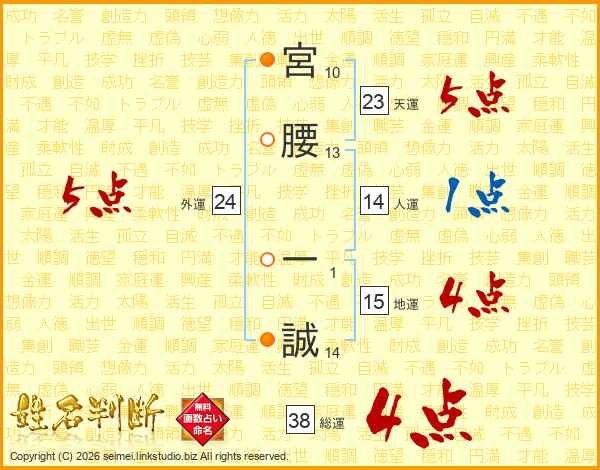 宮(10画)腰(13画) 一(1画)誠(14画)
