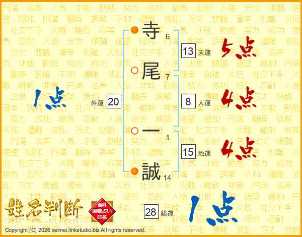 寺(6画)尾(7画) 一(1画)誠(14画)